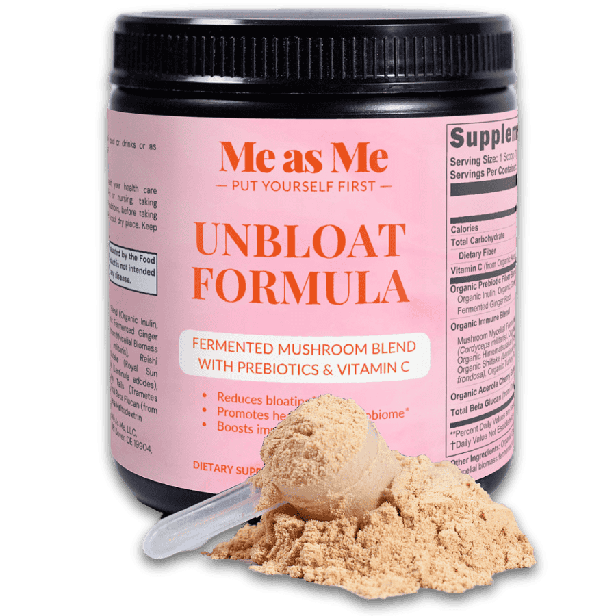 Unbloat Formula™ by Me as Me® is a top-of-the-line product featuring six types of organically grown, fermented mushrooms in their full-spectrum state, along with Vitamin C and an Organic Prebiotic Fiber Blend for superior gut health and digestive support.